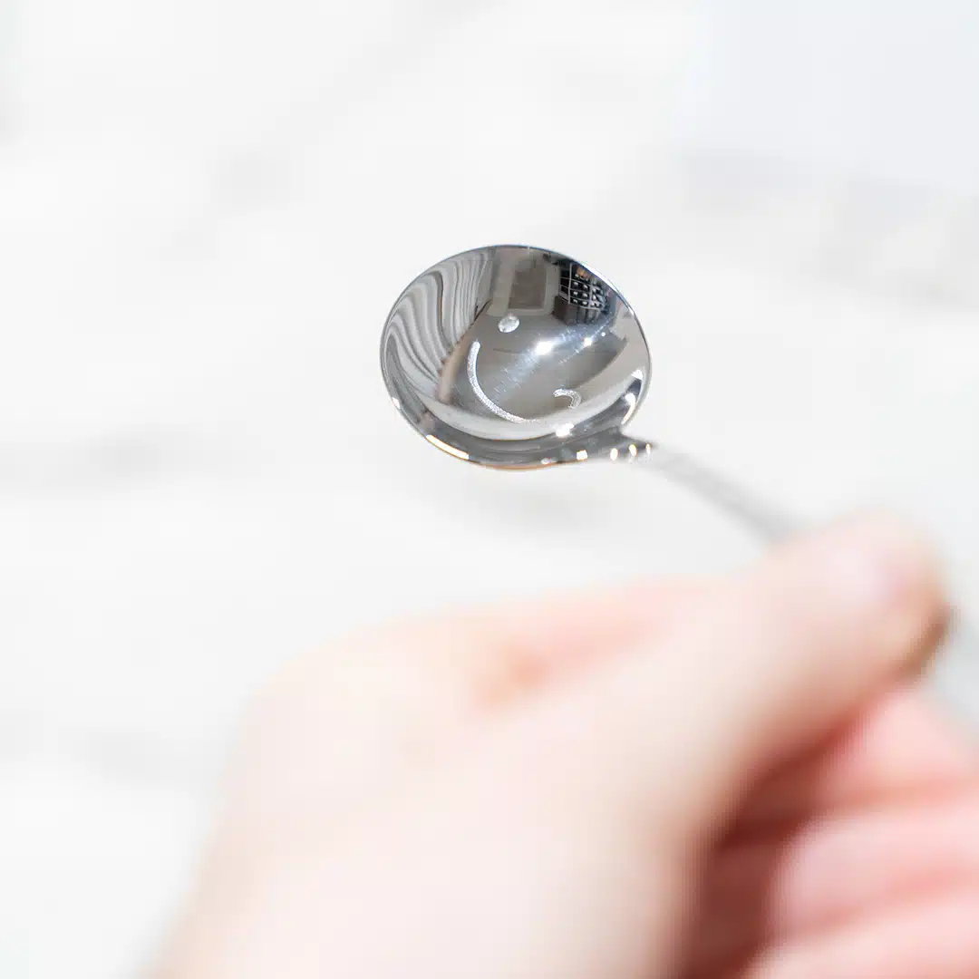 Der Industrie-Standard-Cuppinglöffel von W. Wright aus England, mit eingraviertem sweet spot kaffee Logo am Griff und Smiley im Boden, wie in unserer Cappuccino-Tasse.